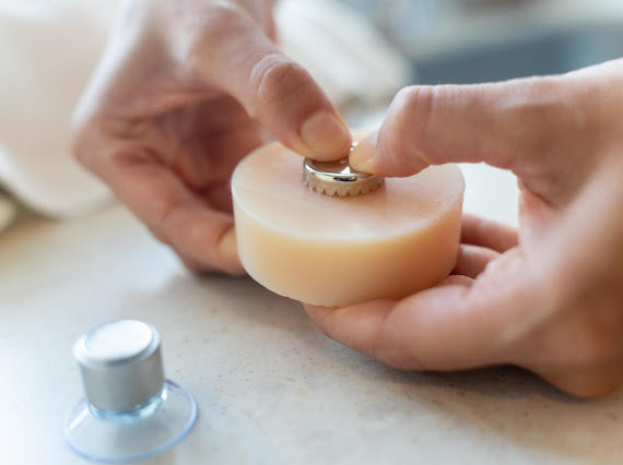 【使用前】 ホルダーの凸凹部分をマグネットから外し、固形石鹸に凸凹面を食い込ませてください。吸盤部分をお好きな場所に固定し、固形石鹸をマグネットに取り付けます。