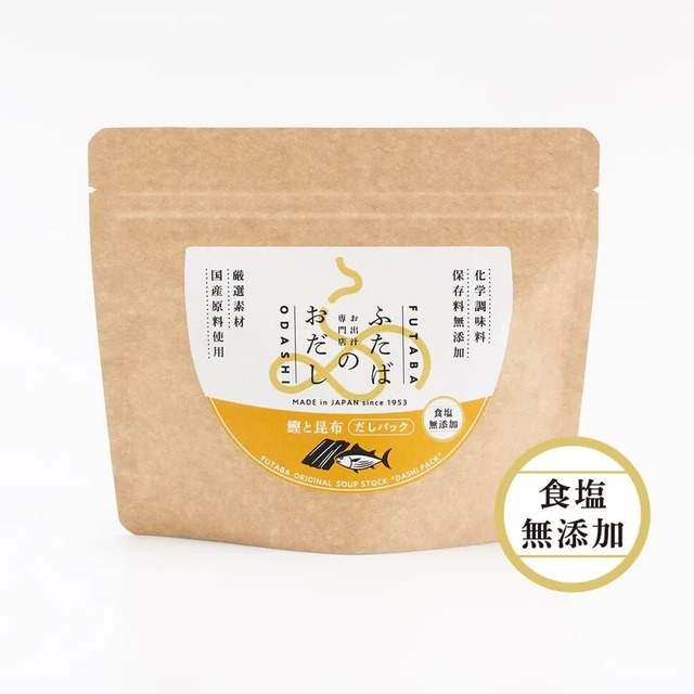 国産かつお節の中から吟味した香り高い原料節と、上品で澄んだだしが特徴の北海道産真昆布のみをブレンドした、化学調味料・食塩・保存料無添加のだしパック。和食の基本、本格的な合わせだしが手軽にひけます。 原材料・素材 かつお節(国内製造)、昆布 製造国・地域 日本 だしの引き方:500ml〜600mlの水を入れた鍋の中にだしパックを入れ、中火にかけ沸騰後5分間煮出し、だしパックを取り出してください。 【ふたばのおだし】 化学調味料・保存料無添加にこだわり、 おだしをきかせた商品を提供する、お出汁専門店です。厳選した原料を、研ぎ澄まされた感覚を持つ仕入れの専門職人が、実際にだしを引いて味覚を確認する官能検査を行い、使用する原料を選定。