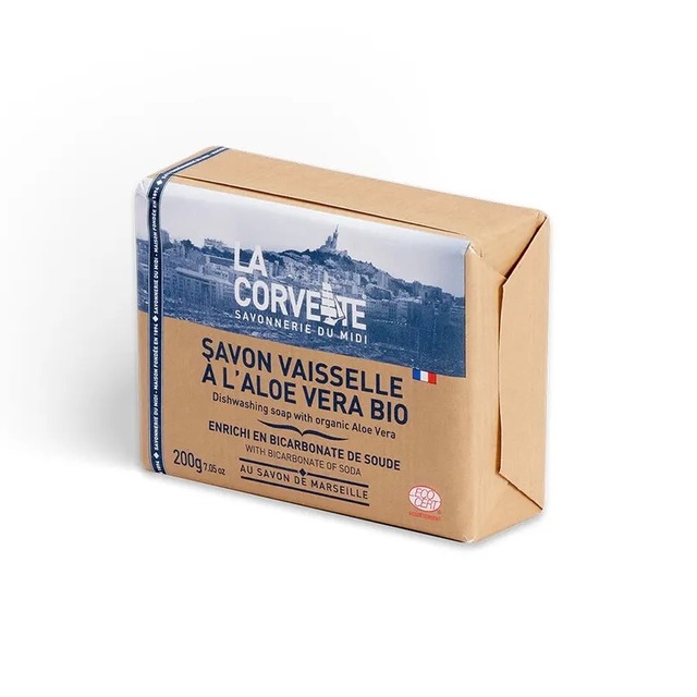 ★伝統的なマルセイユソープに重曹&アロエベラエキスをプラスした食器用石けん。 しつこい油汚れを洗い落とし、手肌にもうるおいを与えます。 -ECOCERTナチュラル洗剤認証取得 -FSC認証紙を採用したサステナブルなパッケージ <ヒントとコツ> お皿についた油は、あらかじめヘラやキッチンペーパーなどで落として置き、ぬるま湯を含ませたスポンジで石鹸を泡立てて優しく食器を洗うのがおススメです。化学的な成分や界面活性剤を使用してないので、市販の液体洗剤の威力よりは優しいですが、環境と手肌に優しく、敏感肌や乾燥肌の方におススメです。 【ブランド紹介】 ラ・コルベットは、本物の「サボン・ド・マルセイユ」を製造する数少ない製造社として、120年以上の歴史を重ねてきたサボネリー・デュ・ミディ社が展開するライフスタイルブランド。ブランド名は、オリーブオイルを運んでいた船の名称から由来しています。基準が守られていない模倣品が増える中、今もなお伝統的な基準を守り、本物の「サボン・ド・マルセイユ」や環境に配慮したサステナブルな製品を世界中に提案し続けています。フランスでは、デパートやセレクトショップなどに展開されています。