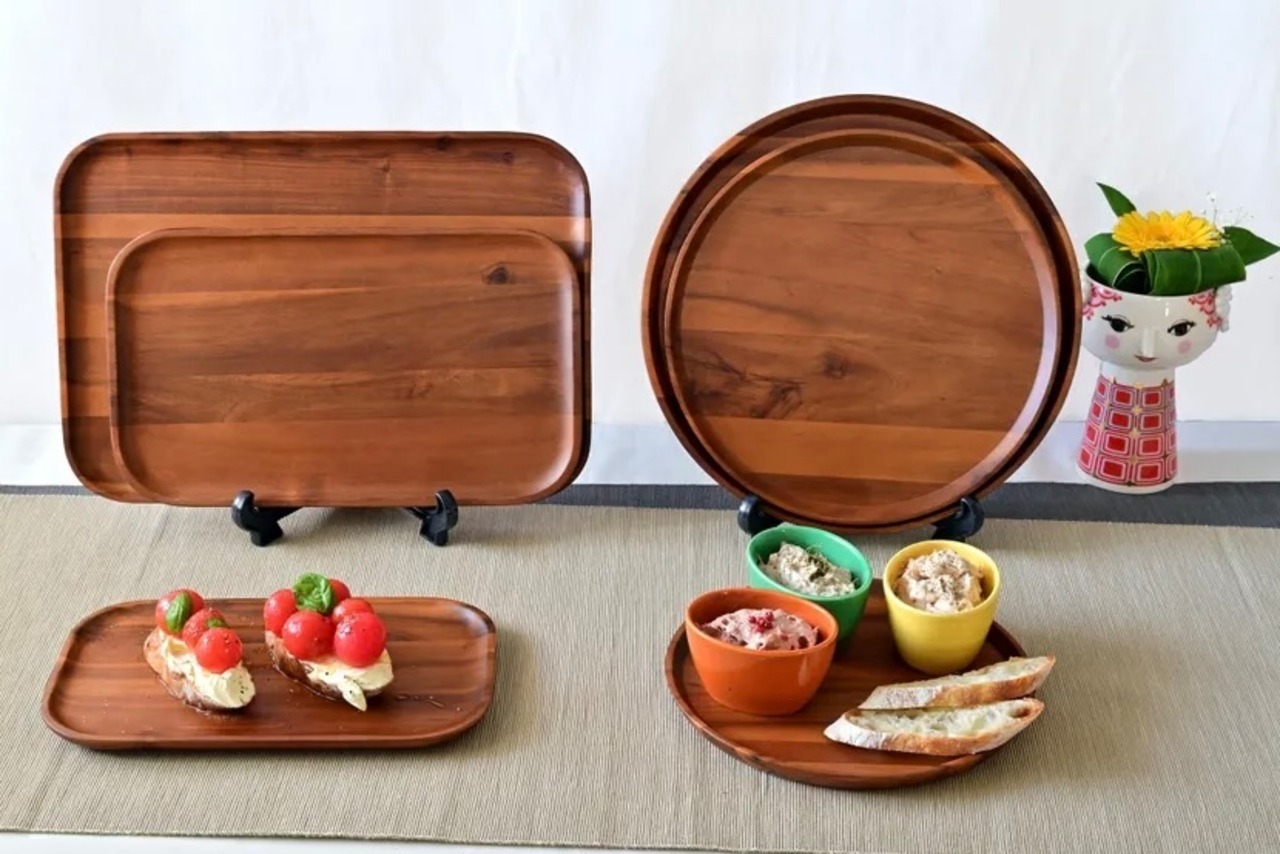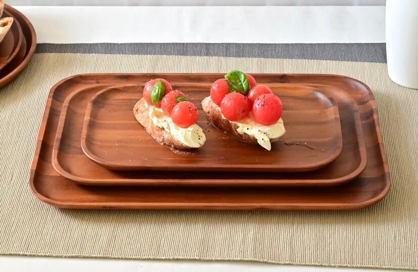 シンプルで飽きがこないデザインを採用したアカシア材のトレイ。 フィンガーフードやスイーツなどをおしゃれに盛りつけることができます。